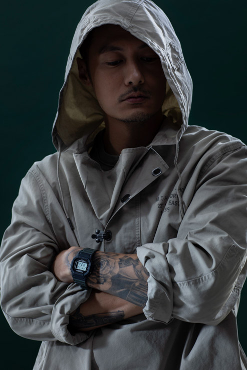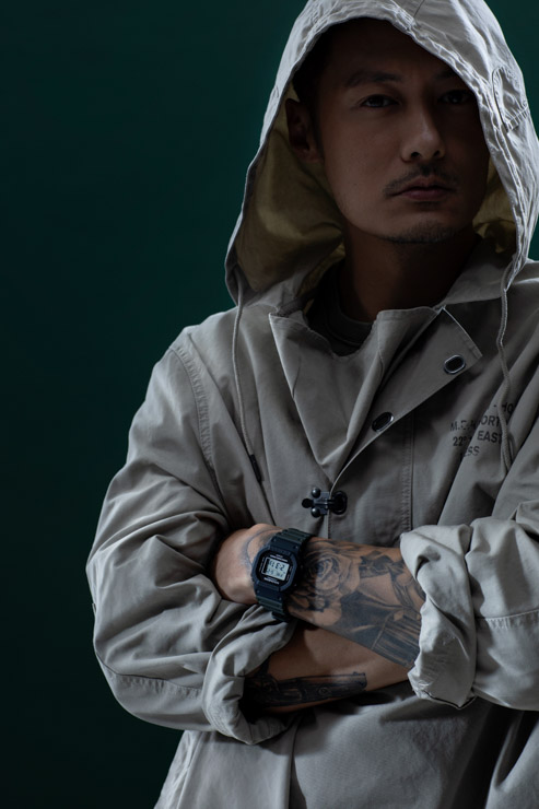 Photography for MADNESS x G-SHOCK collaboration edition DW-5000MD-1 for G-SHOCK 35th anniversary featuring Shawn Yue. Based on the original 1983 DW-5000C, the watch comes a twist with an olive green strap and MADNESS logo imprints.