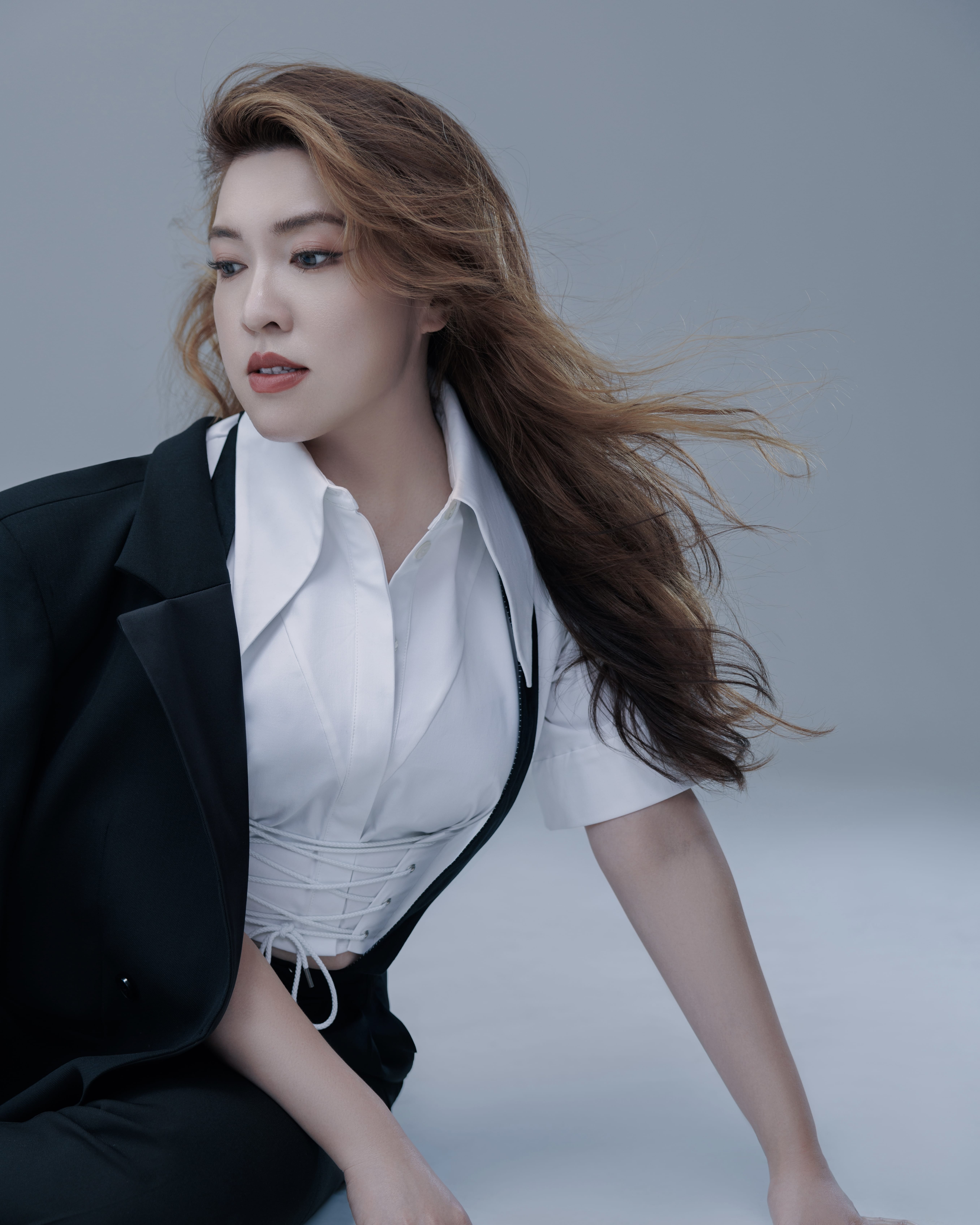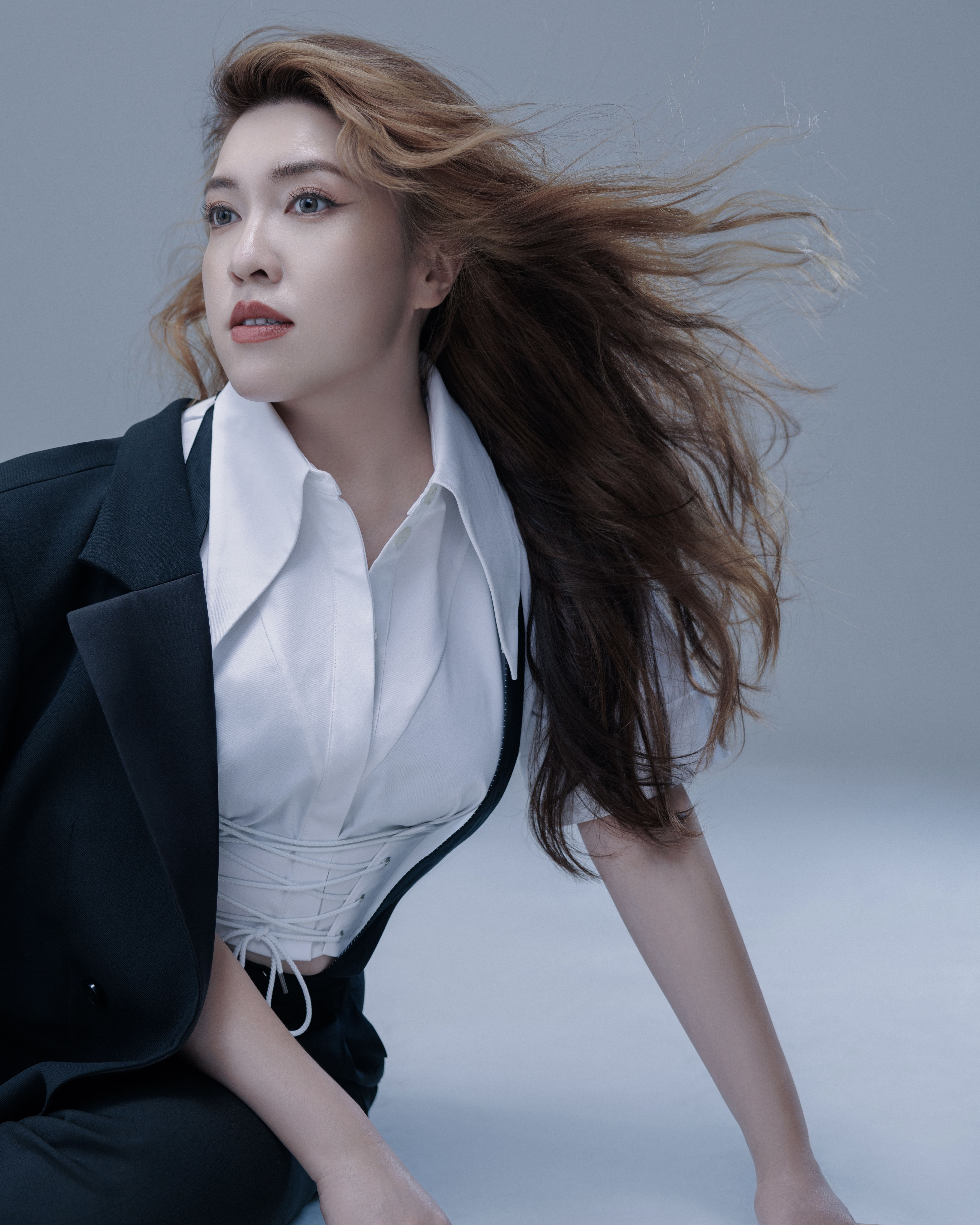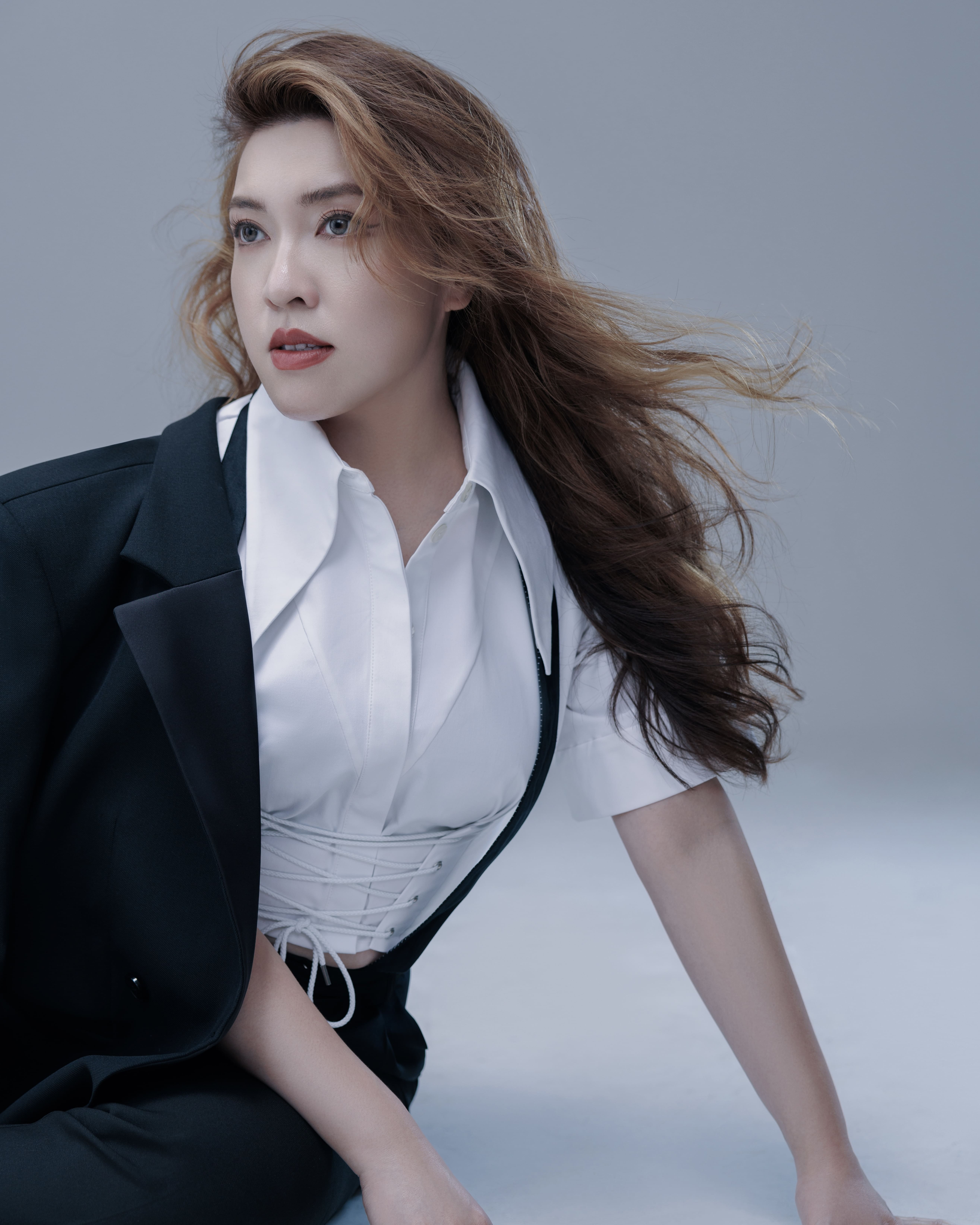 The boyish suits and the strapless corset perfectly highlight her unique charm, creating a beautiful balance that's simply stunning.
